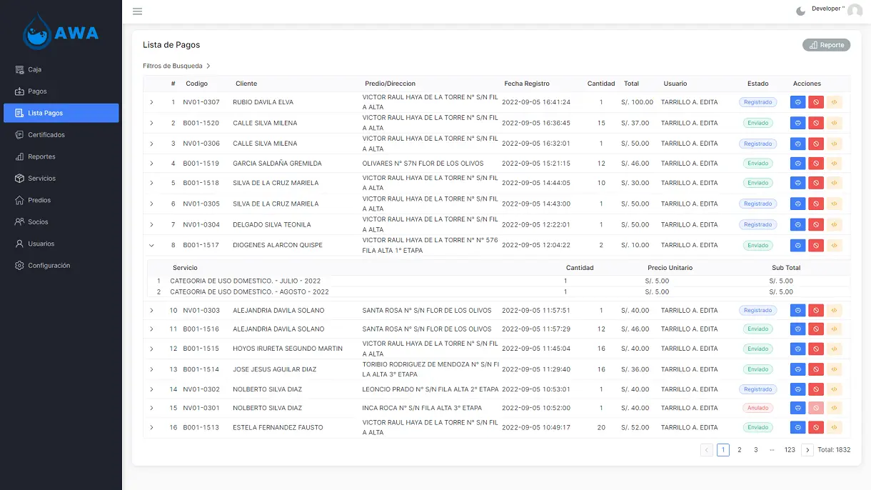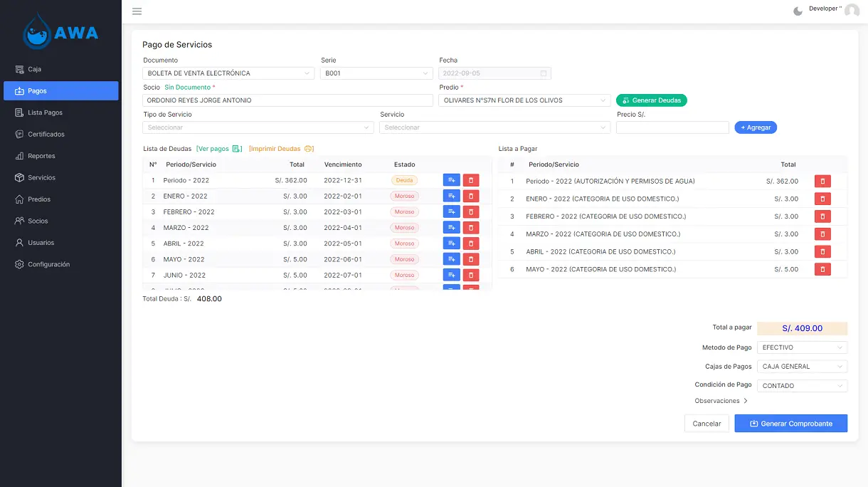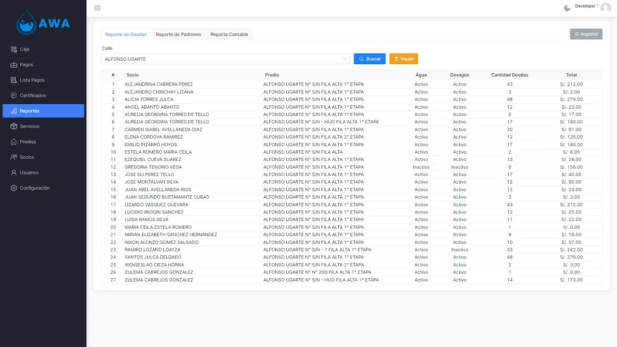 Administrative platform for managing residential properties, with debt control for water and sewer services,Vue.js & Django